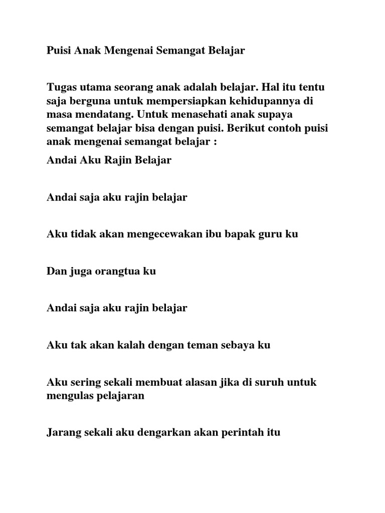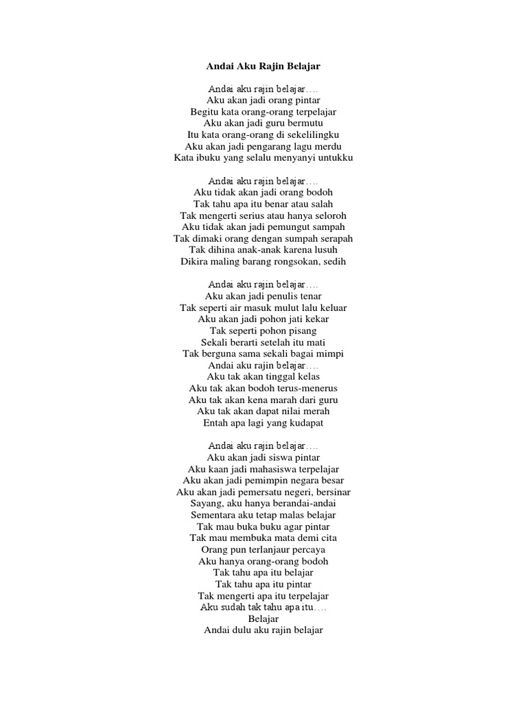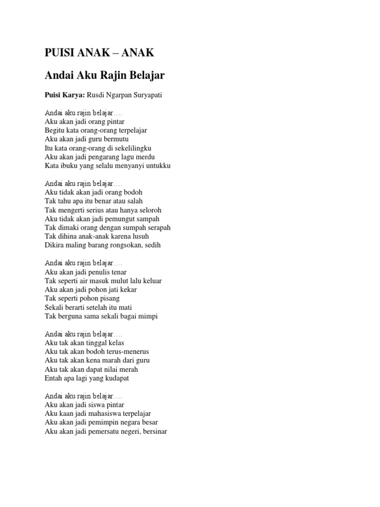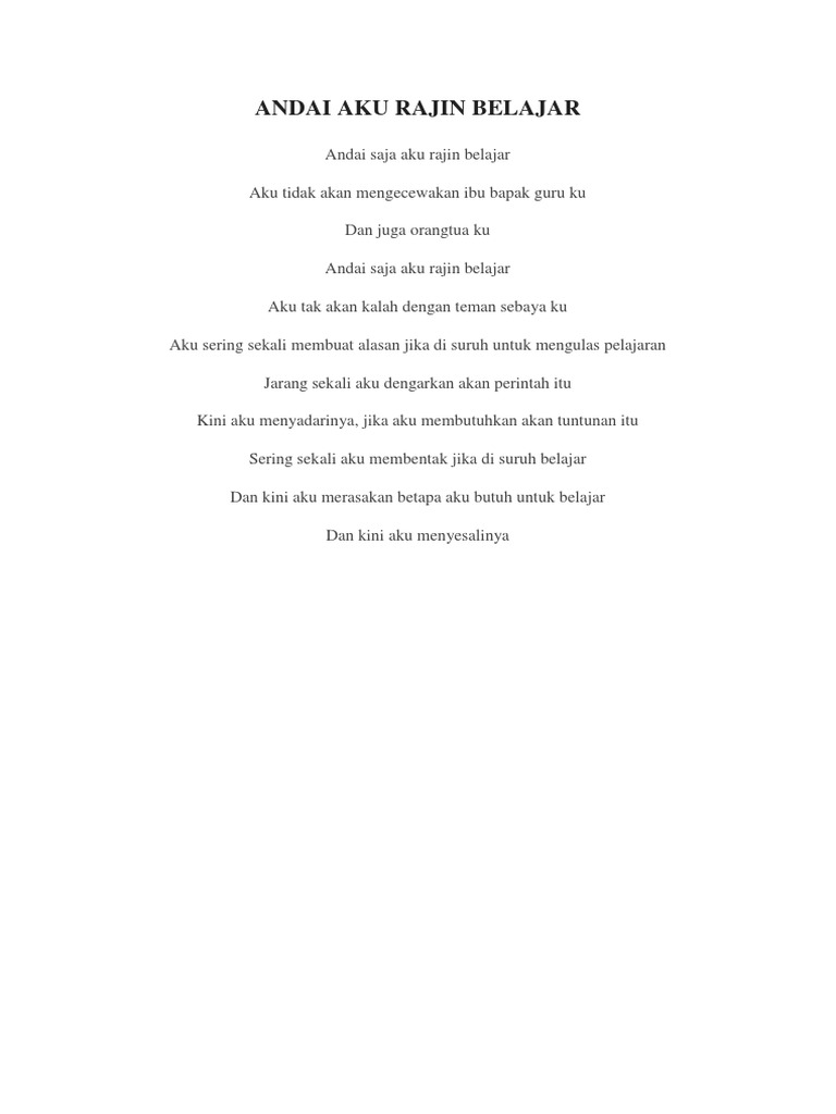Aku akan jadi orang pintar Begitu kata orang-orang terpelajar Aku akan jadi guru bermutu Itu kata orang-orang di sekelilingku Aku akan jadi pengarang lagu merdu Kata ibuku yang selalu menyanyi untukku Andai aku rajin belajar. 1 talking about this. Sering kita jumpai berbagai macam tulisan yang disebut puisi tersaji dalam beraneka media.