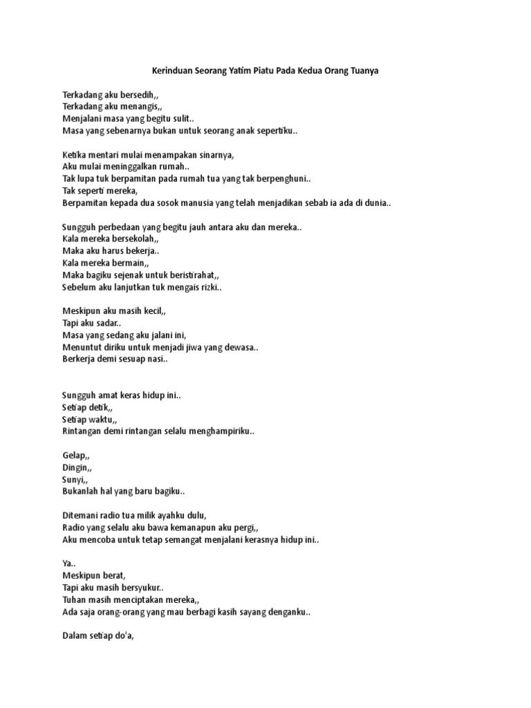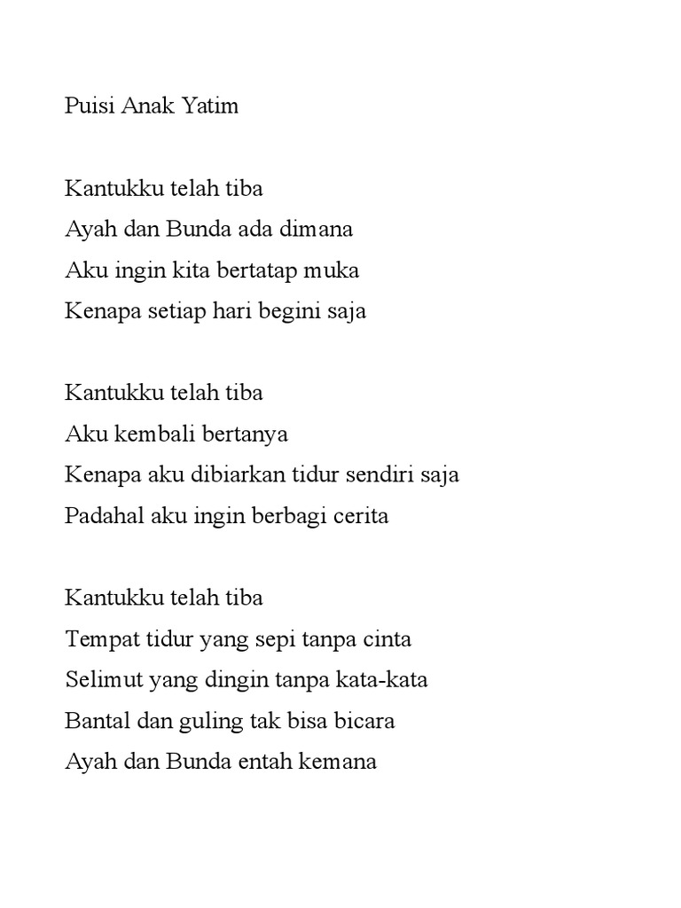 Demikianlah puisi anak yatim piatu. Puisi yang cara membacanya dengan seni membaca maka akan lebih bagus lagi. Penyair Kecil Tuhanku Mengapa ada sejarah dalam hidupku.