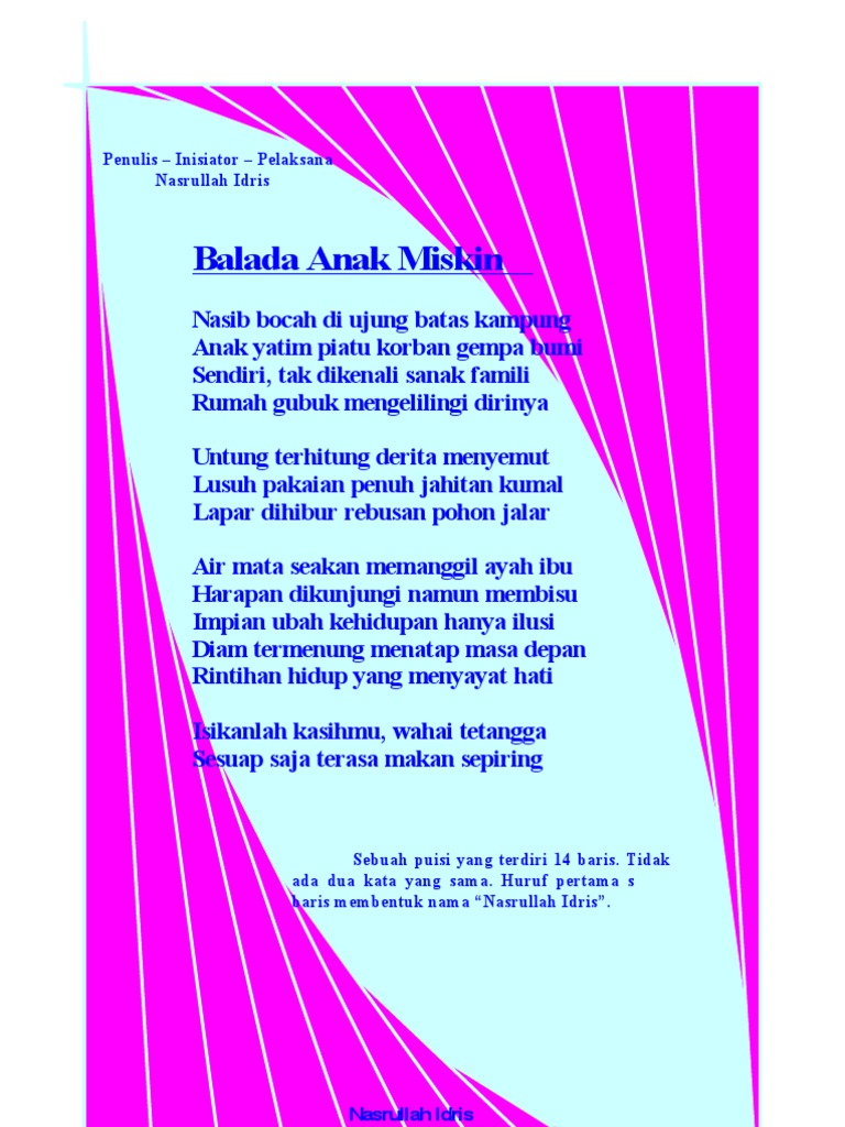 Puisi Religi Puisi SedihCachedSimilarShareView shared postTranslate this pageby ABU NAWAS Apr 14 2013 Berikut ini ada 3 puisi anak yatim piatu yang mengharukan puisi ini mengisahkan tentang hidup seorang anak yati piatu yang sudah tidak berPuisi Sederhana Kerinduan Seorang Yatim Piatu. Tuhanku aku sunyi Tak sempat berpuisi atau bernyanyi Ini aku mutiara dari kedua orang tuaku Dikala diriku sedang bergulir. Empat Puisi Tentang Anak Yatim Piatu Salah satu bait dari empat puisi anak yatim piatu.