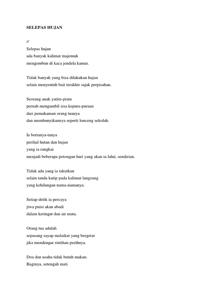 Yatimpiatu ciptaseptiandi Hidup mu sungguh memang berat Harus menerima kenyataan Tapi semua itu Kau terima dengan keiklasan dan ketabahan Di saat ibumu telah tiada Dan bapamu telah tiada Kini kau tinggal seorang diri Tanpa ada yang menemani hari-harimu Mungkin kau hanya bisa berdoa Dan memohon kepada tuhan Supaya kedua orang tuamu Bisa tenang d sanah Setetes keingat yang kau. Kumpulan Puisi Malam Lebaran Update. Puisi doa anak yatim yang dipersembahkan untuk Ayah.